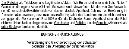Apartheid: Ideologie und Realität "Wir sind ein weißer Stamm, der eine überholte Vision von westlicher Zivilisation verfolgt", sagt Breyten Breytenbach, ein weißer, gegenüber der Apartheid kritisch eingestellter südafrikanischer Schriftsteller. Seit der Konkretisierung der burischen Ideologie im "Großen Treck" und danach hat es mehr als 150 Jahre gedauert, bis eine Mehrheit der Weißen in Südafrika dieser Aussage Breytenbachs uneingeschränkt zustimmen würde. Für Schüler kann man das Zitat in einer Klausur an das Ende von Baustein B stellen und es dann mit dem erarbeiteten Wissen erörtern lassen. Die Materialien B 8 und B 9 zeigen uns schon viele Facetten einer geschlossenen Weltanschauung, die für die Herrschaftsausweitung und den Überlebenskampf der Buren im 19. Jahrhundert sehr nützlich war und sich nicht von den nationalistischen und rassistischen Parolen aus anderen imperialistisch geprägten Gesellschaften dieser Zeit unterschied. Das 20. und das beginnende 21. Jahrhundert sind dann keineswegs davon freigeblieben. Anachronistisch war in Südafrika wie in den USA der Fünfziger- und Sechzigerjahre des 20. Jahrhunderts lediglich die Praxis, die sich aus einer solchen Ideologie ergab. Gegen diese erhob sich hier wie dort auch der Widerstand, lange in gewaltfreien Formen. Lehrreich ist es, die Weltanschauung der Apartheid mit der des Nationalsozialismus zu vergleichen. Aber reizvoll wäre es auch, zum Beispiel in Zusammenarbeit mit dem Englisch-Unterricht, die Bürgerrechtsbewegung und ihre Träger in den USA mit den Etappen des Kampfes gegen die Apartheid in Südafrika besonders von Seiten des ANC zu vergleichen (Martin Luther King und Steve Biko; Stokely Carmichael und Miriam Makeba). Walter Michler (Weißbuch Afrika, S. 218) hat, was er in B 8 zur Apartheid ausführt und was in B 10 bis B 17 verdeutlicht ist, in einem detailreichen Schaubild zusammengestellt, das für Schüler einen guten Überblick zur Sicherung des Erarbeiteten bietet (Schaubild 4).