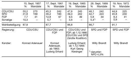 Nach: Statistisches Bundesamt (Hg.): Bevölkerung und Erwerbstätigkeit. Sonderheft 40 Jahre Wahlen in der Bundesrepublik Deutschland, Stuttgart 1989, S. 6-13. C 5 Dramatische Tage im Herbst 1966 26. Oktober Zustimmung der FDP zu einer Kompromisslösung bei der Sanierung des Bundeshaushaltes 27. Oktober Rücktritt der FDP-Bundesminister wegen notwendig werdender Steuererhöhungen; Ende der Regierungskoalition aus CDU/CSU und FDP 28. Oktober Loyalitätserklärung des Vorsitzenden der CDU/CSU-Bundestagsfraktion, Rainer Barzel, für Bundeskanzler Ludwig Erhard 2. November Erklärung Ludwig Erhards zum Verzicht auf das Amt des Bundeskanzlers 6. November Wahlerfolg der NPD bei den Landtagswahlen in Hessen (7,9 %; 8 Mandate) 7. November Aufforderung der SPD- und der FDP-Bundestagsfraktion an Ludwig Erhard, die Vertrauensfrage zu stellen 8. November Vorlage des SPD-Papiers "Aufgaben einer neuen Bundesregierung" (im Falle einer SPD-Beteiligung) 10. November Abstimmung in der CDU/CSU-Fraktion über einen neuen Kanzlerkandidaten: Entscheidung für den Ministerpräsidenten von Baden-Württemberg, Kurt Georg Kiesinger 15. November erste gemeinsame Sitzung der Verhandlungskommissionen der CDU/CSU und der SPD über die Bildung einer Großen Koalition 20. November Wiedererlangung der absoluten Mehrheit der CSU bei den bayerischen Landtagswahlen; Einzug der NPD in den Landtag von Bayern (7,4%; 15 Abgeordnete) 24. November entscheidender Durchbruch bei den Koalitionsverhandlungen von CDU/CSU und SPD 25. November offizielles Angebot des FDP-Vorsitzenden Erich Mende zur Bildung einer Koalition aus SPD und FDP 26. November Erklärung der Verhandlungskommissionen von CDU/CSU und SPD über die Bildung einer Großen Koalition 28. November Zustimmung der CDU/CSU-Bundestagsfraktion zur Bildung der Großen Koalition 30. November formelles Rücktrittsgesuch des Bundeskanzlers Ludwig Erhard; Zustimmung der SPD-Bundestagsfraktion zur Bildung einer Großen Koalition; massive Kritik des Schriftstellers Günter Grass an "dieser miesen Ehe" (im "Vorwärts" vom 30.11.1966) 1. Dezember Wahl Kurt Georg Kiesingers zum Bundeskanzler 8. Dezember konstruktives Misstrauensvotum im Landtag von Nordrhein-Westfalen: Abwahl des bisherigen Ministerpräsidenten Meyers (CDU); Wahl von Heinz Kühn (SPD) und Bildung einer Koalitionsregierung aus SPD und FDP in Nordrhein-Westfalen 13. Dezember Regierungserklärung des Bundeskanzlers Kurt Georg Kiesinger für die Große Koalition. 16. Dezember Bildung einer Großen Koalition in Baden-Württemberg (Ministerpräsident: Hans Filbinger, CDU) Nach Reinhard Schmoeckel/ Bruno Kaiser: Die vergessene Regierung, Bonn (Bouvier) 1991; und: Taschenbuch Baden-Württemberg, Ausgabe 1999 C 6 Voraussetzungen für die Große Koalition Allen Politikern aus CDU/CSU und SPD, die sich im November 1966 in Verhandlungen über eine Koalition dieser Parteien im Bundestag verständigten, war völlig klar, dass dieser Zustand nur eine vorübergehende, zeitlich begrenzte Ausnahme im politischen Leben unseres Staates sein dürfte. Auf der anderen Seite war die zweite Hälfte der sechziger Jahre eine Zeit, wo sich unter Politikern und auch bei der großen Mehrzahl der Wähler die Überzeugung Bahn gebrochen hatte, dass alle drei damaligen Parteien in der Bundesrepublik miteinander koalitionsfähig seien. Keiner der drei Parteien erschien grundsätzlich eine Regierungsbeteiligung einer der beiden anderen als der "Untergang Deutschlands". Eine Teilung der Regierungsverantwortung mit einer der beiden anderen Parteien war nicht mehr mit einem Tabu belegt. Keine unüberwindlichen weltanschaulichen Gräben trennten die Parteien mehr voneinander, wie noch in den ersten Jahren der Bundesrepublik. Gerade die beiden großen Parteien waren im Bestreben, "Volkspartei" zu werden und praktisch für alle Schichten der deutschen Bevölkerung wählbar zu sein, einander ähnlicher geworden. Ihr Umgang miteinander hatte sich längst entkrampft. Insofern erscheint die Zeit der Großen Koalition, rückblickend betrachtet, zugleich als eine Epoche demokratischer Normalität im Verhältnis der politischen Parteien untereinander. Reinhard Schmoeckel/ Bruno Kaiser: Die vergessene Regierung, Bonn (Bouvier) 1991, S. 15. |