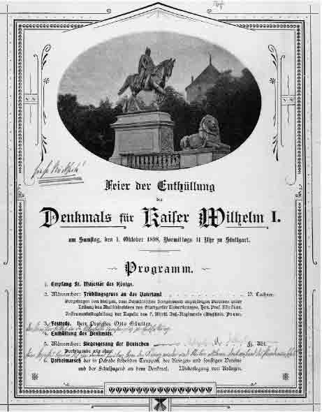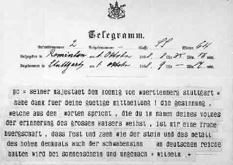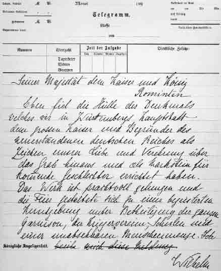 Mögen mir gestatten, im Namen des Ausschusses zur Errichtung eines Denkmals für Seine Majestät den Höchstseligen Kaiser Wilhelm I., dessen Ehrenpräsident ich mit der Allerhöchsten Genehmigung Eurer Majestät bin, und damit auch in meinem eigenen, folgendes allerunterthänigst vorzutragen.