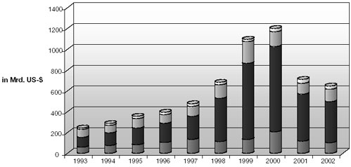 Direktinvestitionen - das sind Anlagen in Firmen, Betriebsstätten und Vertriebsnetzen im Ausland - fließen vor allem dort hin, wo das investierte Kapital eine hohe Rendite abwerfen kann. Die internationalen Investoren schauen dabei nicht nur auf die Chancen des einzelnen Projekts oder des Zielunternehmens, sondern auch auf die konjunkturellen und politischen Rahmenbedingungen. Die Grafik zeigt die weltweiten Direktinvestitionen (Auslandsinvestitionen), aufgeschlüsselt nach den Anteilen der Triade (EU, USA und Japan) im Vergleich zu den restlichen Ländern der Welt. Grafik: P&U, Quelle: UNCTAD