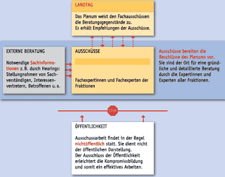 Um die verschiedenen landespolitischen Themen intensiv diskutieren zu können, ist in der Vollversammlung des Parlaments, im Plenum, keine Zeit. Daher werden so genannte (Fach-)Ausschüsse gebildet. Ein Ausschuss ist im Prinzip ein verkleinerter Landtag. Jede Fraktion entsendet entsprechend ihrer Stärke eine bestimmte Anzahl an Abgeordneten in jeden Ausschuss. An den Namen der Ausschüsse kann man schnell erkennen, für welche Themen sie zuständig sind. Die Fachausschüsse sind so gegliedert, dass sie den einzelnen Ministerien der Landesregierung entsprechen. Derzeit gibt es neun Fachausschüsse im Landtag, die - bis auf den Finanzausschuss mit 21 Mitgliedern - 18 Mitglieder haben. Darüber hinaus gibt es Ausschüsse und Gremien mit besonderen Aufgaben, wie z. B. den Petitionsausschuss oder das so genannte "Notparlament". Die Ausschüsse lassen sich mit den Arbeitskreisen der Fraktionen vergleichen. Beide tagen nichtöffentlich, d. h. hinter verschlossenen Türen. Hier treffen sich Sachverständige in einem kleineren Kreis - jetzt allerdings fraktionsübergreifend -, um sich zu beraten. So wie die Ausschüsse Empfehlungen an das Plenum aussprechen, so geben auch die Arbeitskreise Empfehlungen an die jeweilige Fraktion. Die Ausschüsse beschließen nur über Angelegenheiten, die ihnen vom Plenum überwiesen wurden. Sie dürfen von sich aus keine weiteren Themen aufgreifen, an deren Beratungsende eine Beschlussfassung steht. Der Fachausdruck hierfür lautet: Die Ausschüsse haben kein "Selbstbefassungsrecht".