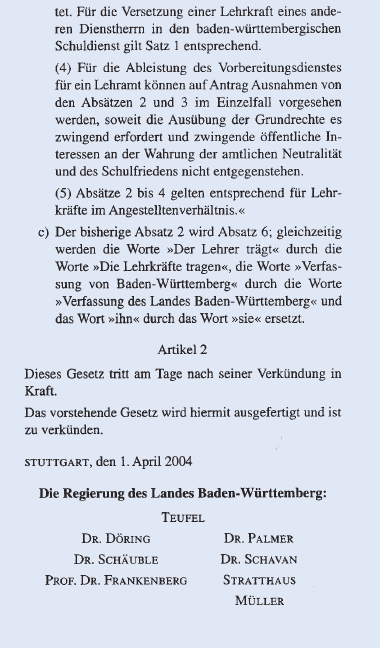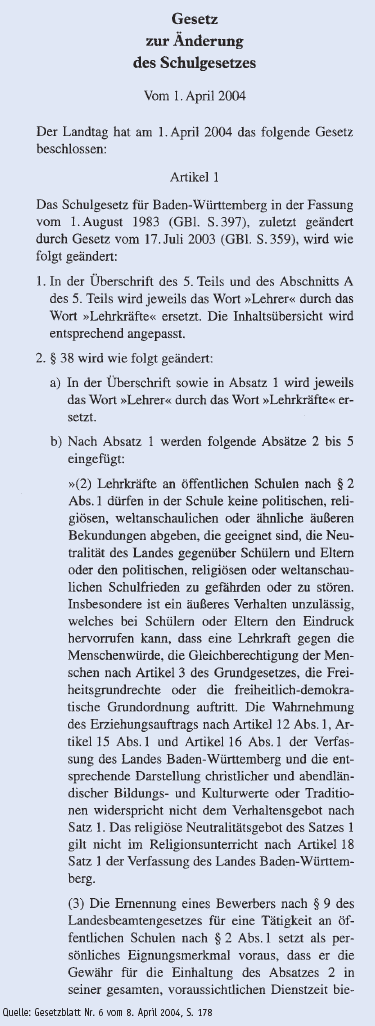 Die EU-Kommission hat sich in den deutschen Kopftuchstreit eingeschaltet. Ein Sprecher des baden-württembergischen Kultusministeriums bestätigte Zeitungsberichte, wonach die Kommission um Auskunft über die Neuregelung des baden-württembergischen Schulgesetzes gebeten habe. Die EU-Kommission habe die Sorge, dass die Anti-Kopftuch-Gesetze verschiedener Bundesländer mit dem Diskriminierungsverbot des europäischen Rechts unvereinbar sein könnten. Grundlage dafür seien drei Gleichbehandlungsrichtlinien der EU sowie die Europäische Konvention der Menschenrechte. Das Leipziger Bundesverwaltungsgericht wies ... hingegen die Klage der muslimischen Lehrerin Fereshta Ludin auf Einstellung in den baden-württembergischen Schuldienst ab und bestätigte die Verfassungsmäßigkeit des geänderten Stuttgarter Landesschulgesetzes. Welt am Sonntag vom 27. Juni 2004